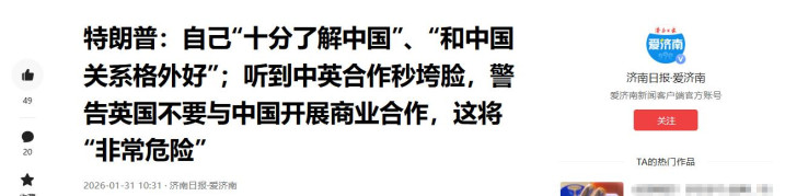 但问题在于,这种情绪化的表达,已经很难再对盟友形成真正的威慑;尤其是在特朗普一边警告别人远离中国,一边又高调宣称“我和中国关系最好”的前提下,这种双重标准,反而暴露出一种强烈的占有欲和不安全感。